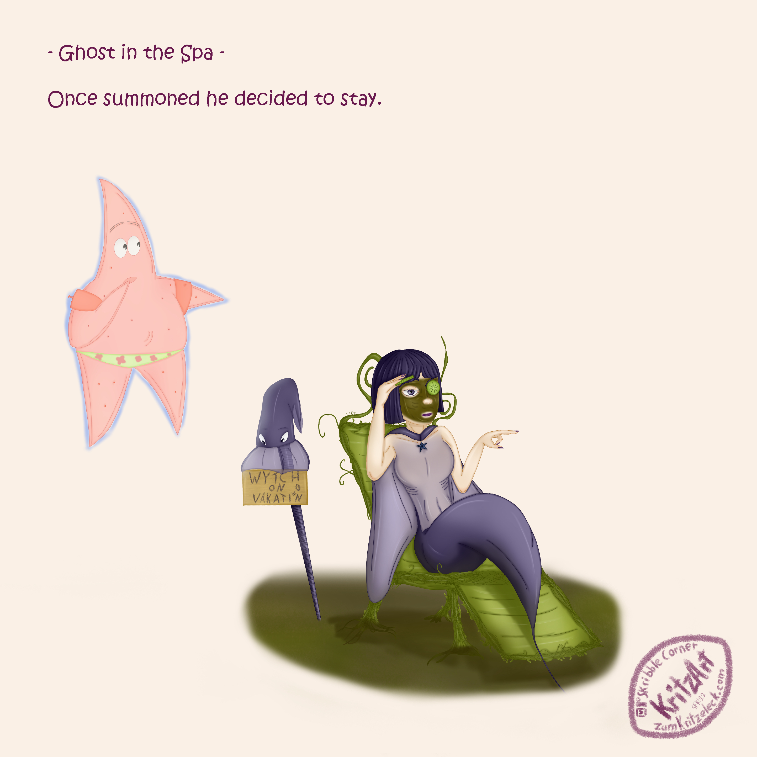The Little Sea Witch having some relaxing times in the spa. She is accompanyied by a ghost starfish she summoned during a failed conjuring in Mermay 2021 and Raven and Sam in their amphibious forms. As usual her magic doings have unintentioned side effects.