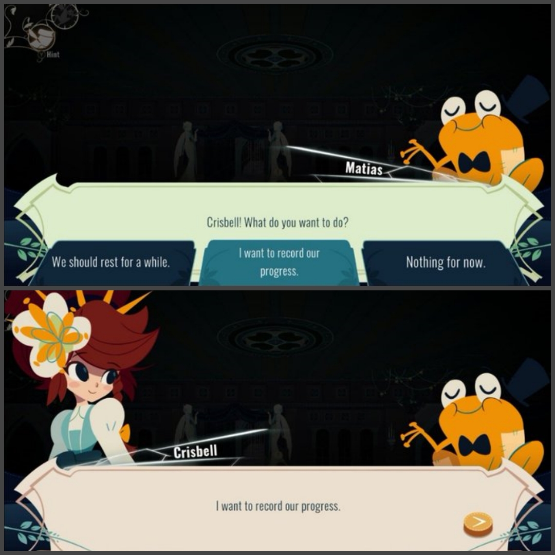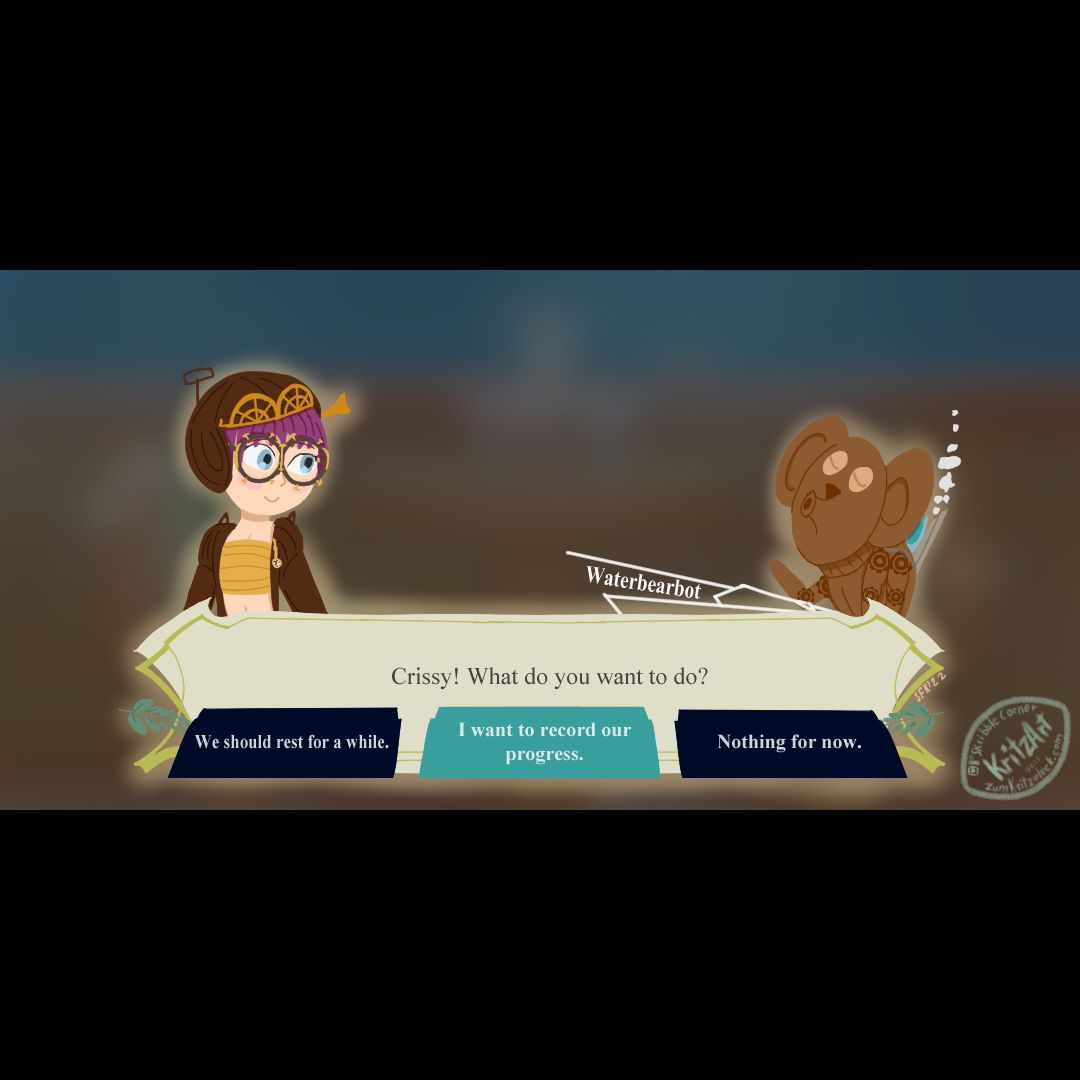 So, my mind came up with this Crissy x CrisTales crossover, depicting one of the dialogs which very very fast sticks in your head once you started to play (by now I can recite it by heart). I tried to meet the art style of the game but I also allowed me some artistic license, obviously, and instead of Matias the frog you get Crissy’s Water Bear Bot (you will find two screenshots I took on see the last slide for reference):
