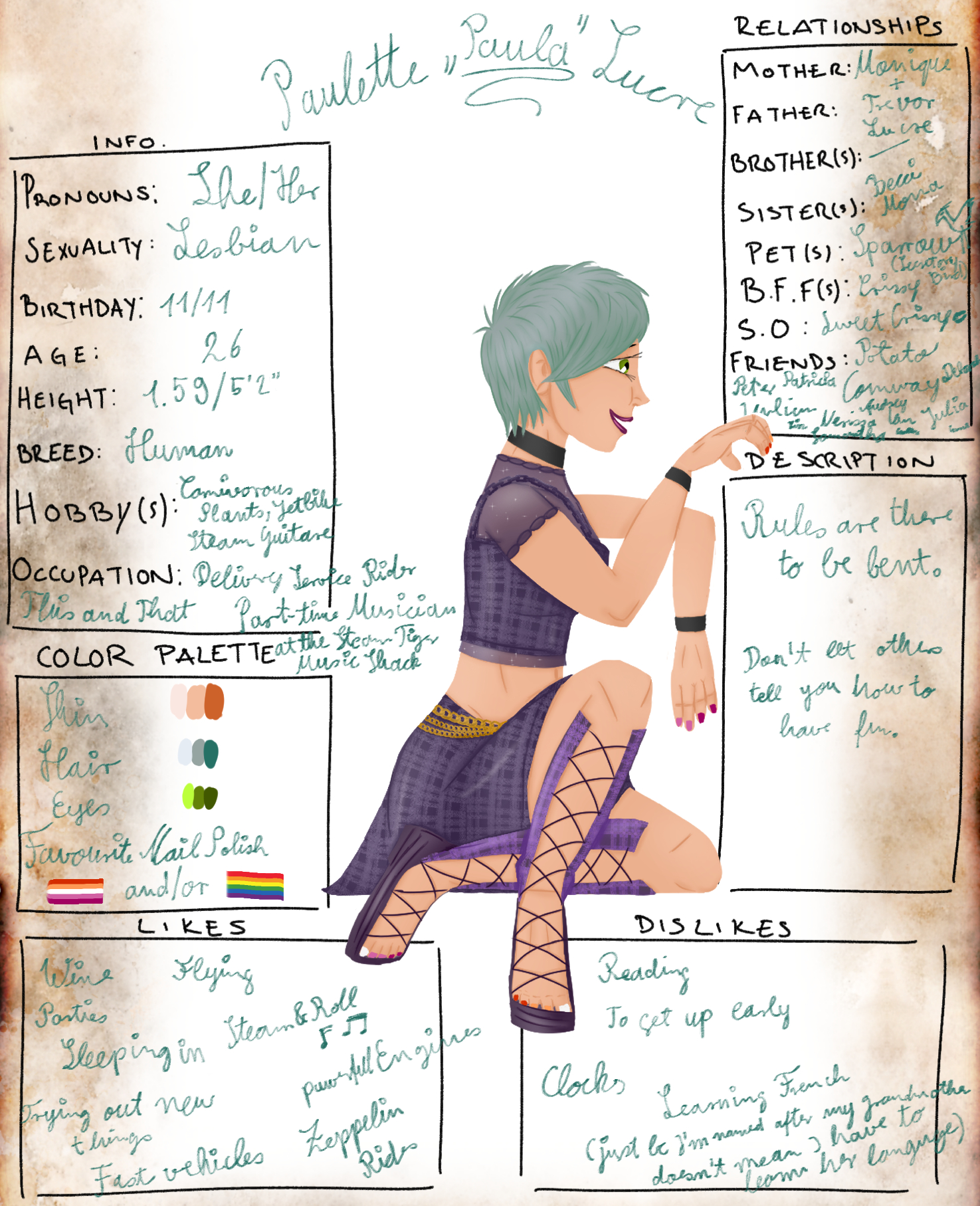 Since the first presentation (see the 1st main prompt) there has been some development and new ideas about her. Therefore I decided to elaborate her charactersheet and to add one showing her as person, not only her doing her job. Additionally, Potato Beta, a member of the Arcryla City Discord Server created a template for free use. So I filled it in as if Crissy herself filled it in and did the same with her girlfriend Paula: