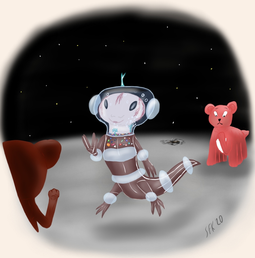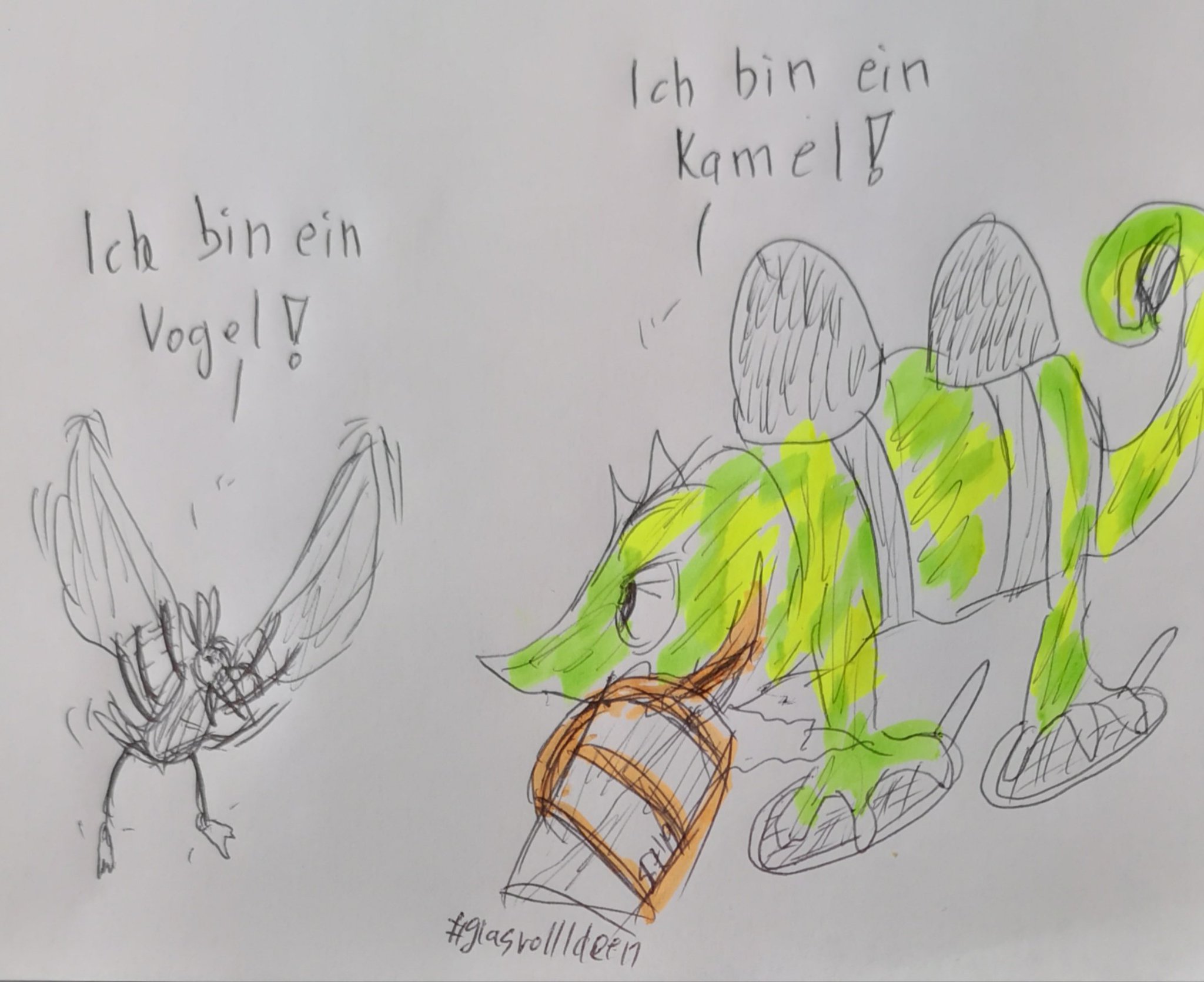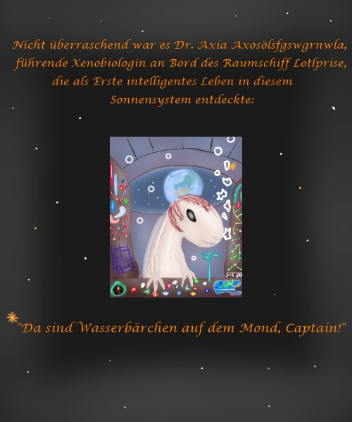 Regelmäßig zieht sie zwei Zettel mit Stichworten aus einem Glas, aus denen wir dann kreativ war machen können. Auf diese Weise sind bisher über 50 Stichwort-Kombinationen zustande gekommen. Die Stichworte wurden von uns anderen Teilnehmern eingereicht.