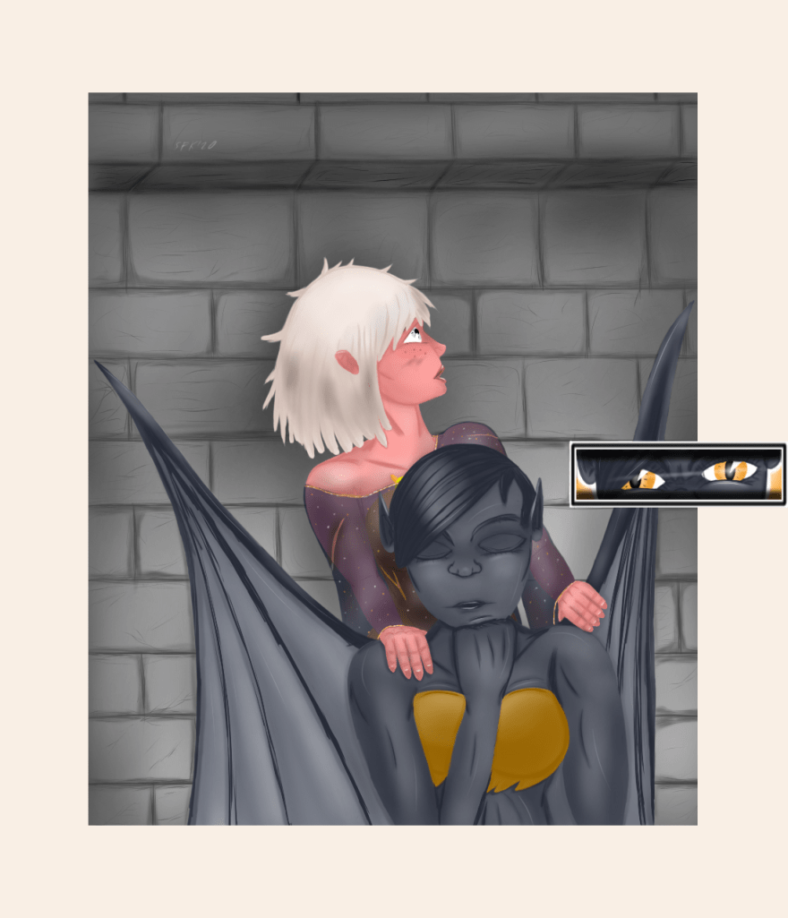 „Ich werde es herausfinden“, sprach die Gargoyle – zum ersten Mal – und mit einem lauten Knall entfalteten sich die Schwingen, sehr zum Schrecken Lucas und der Prinzessin.