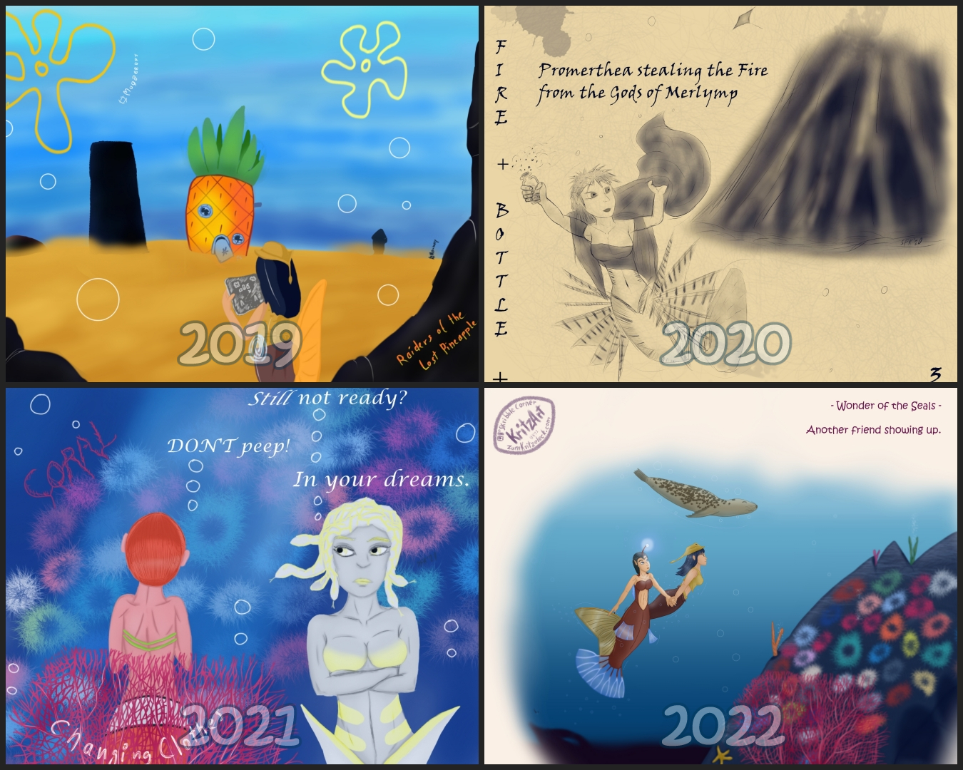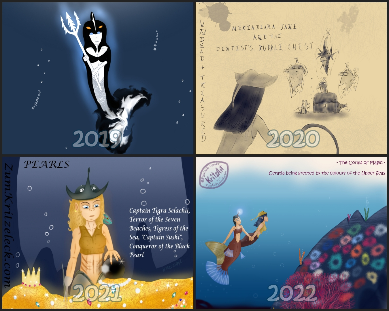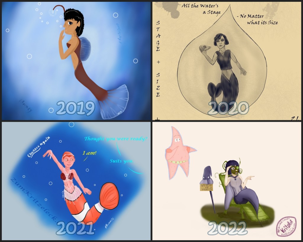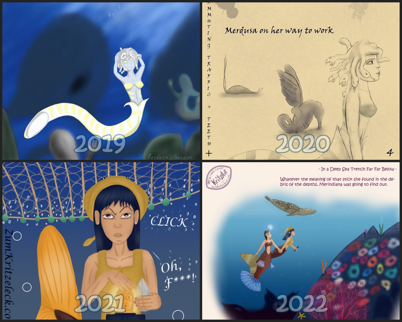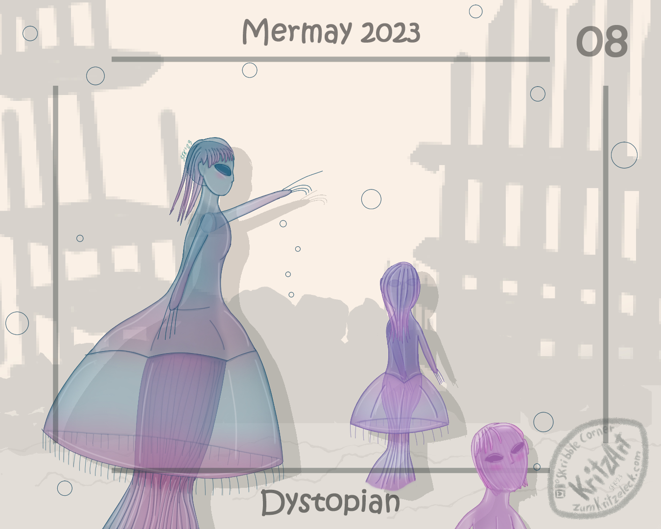 In 2023 I will go with the official Mermay prompt list. This time, it’s a special Mermay to me because it’s my fifth participation in a row. Starting with 2019 I managed to create every May for every day at least a sketch, a collage, but mostly a full drawing in different styles, colour schemes and approaches. Therefore, in 2023 I not only drew the given prompts, but also collages of past paintings of every day in previous Mermays.