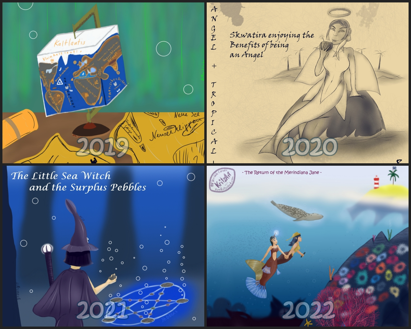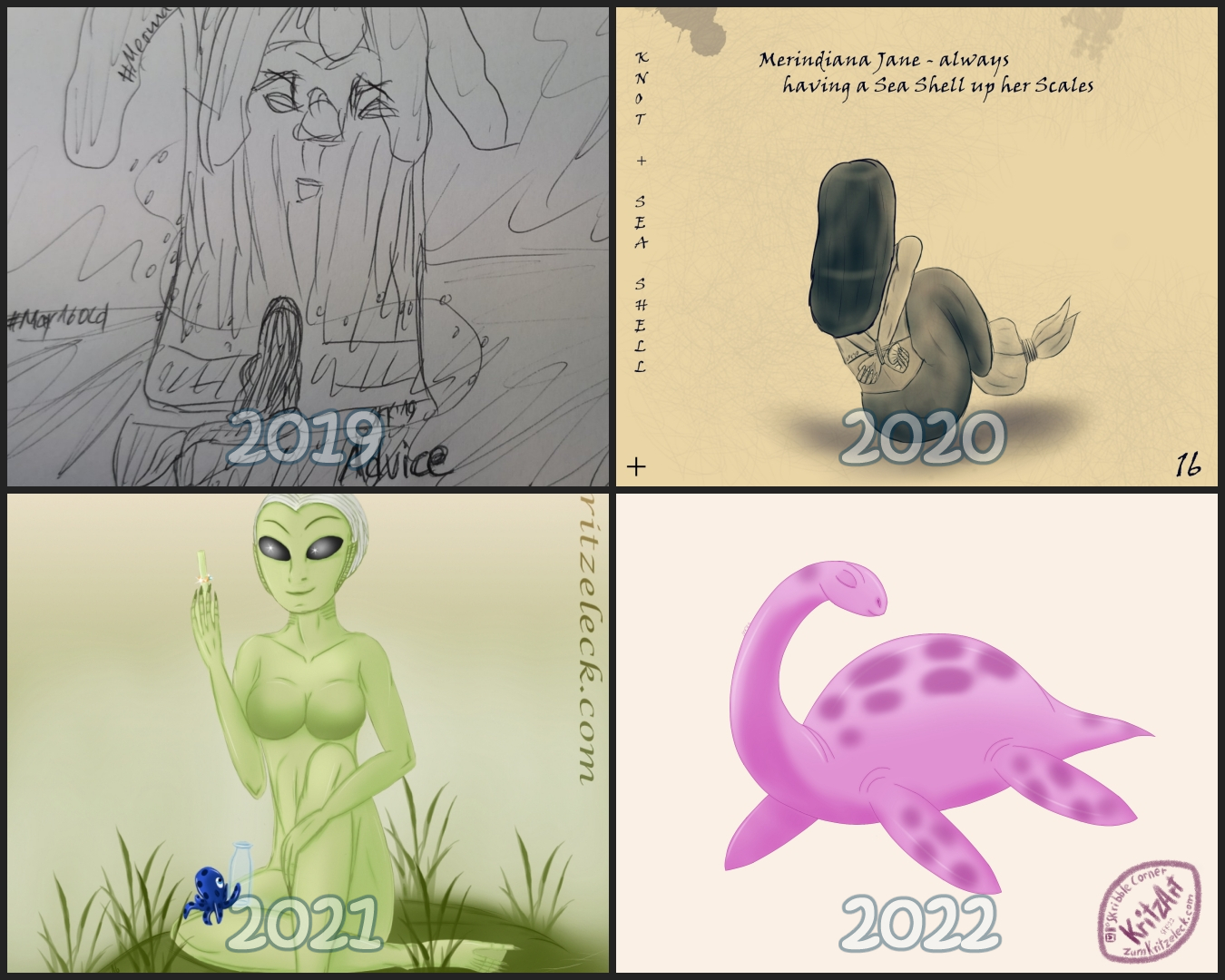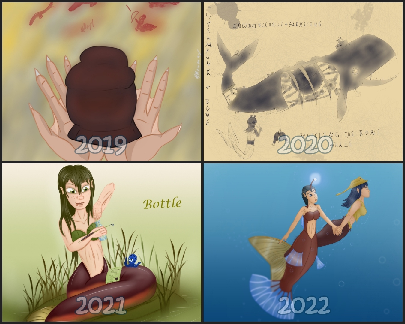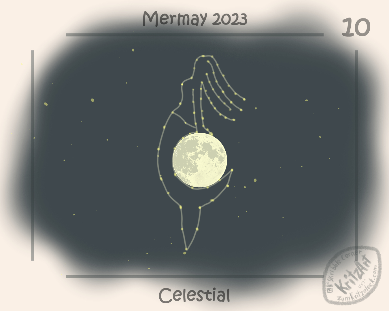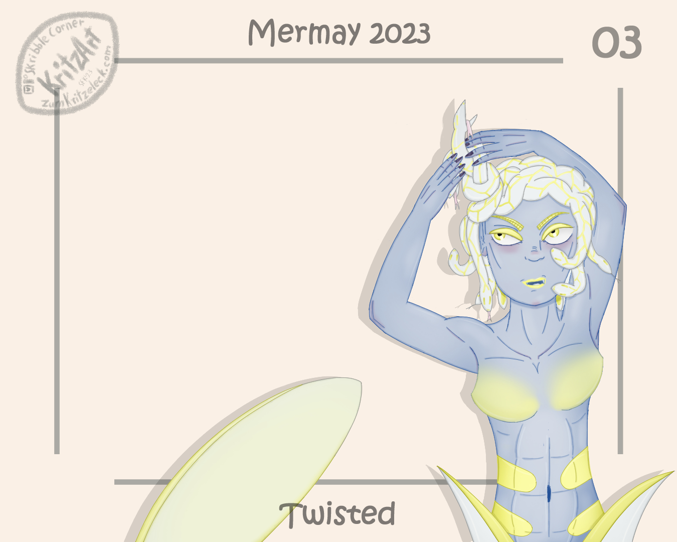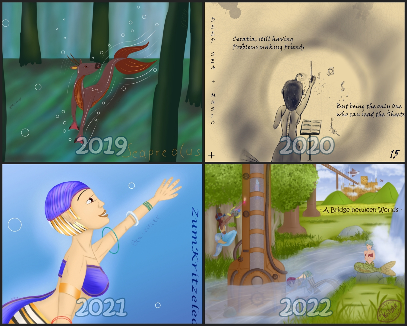In 2023 I will go with the official Mermay prompt list. This time, it’s a special Mermay to me because it’s my fifth participation in a row. Starting with 2019 I managed to create every May for every day at least a sketch, a collage, but mostly a full drawing in different styles, colour schemes and approaches. Therefore, in 2023 I not only drew the given prompts, but also collages of past paintings of every day in previous Mermays.