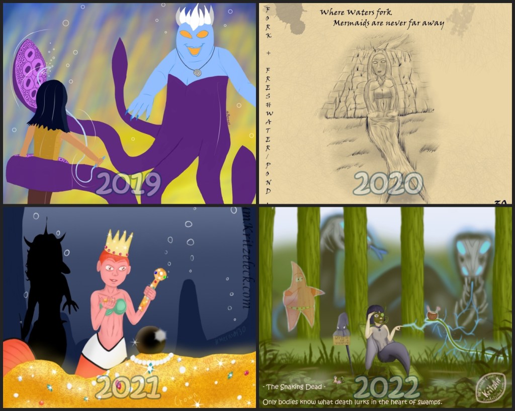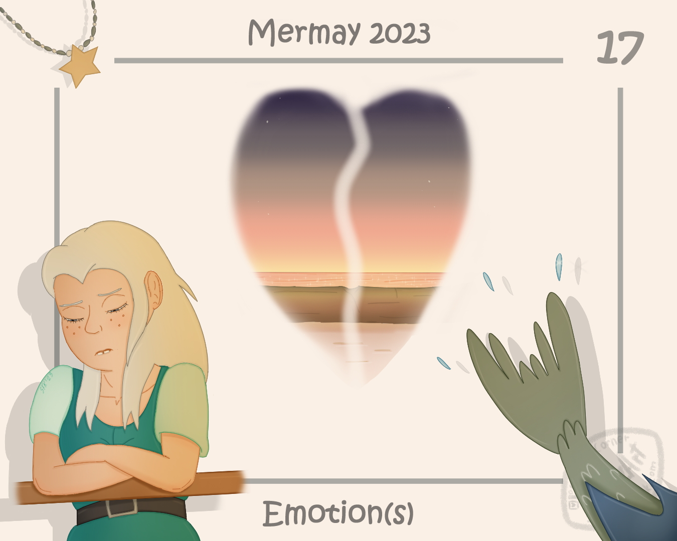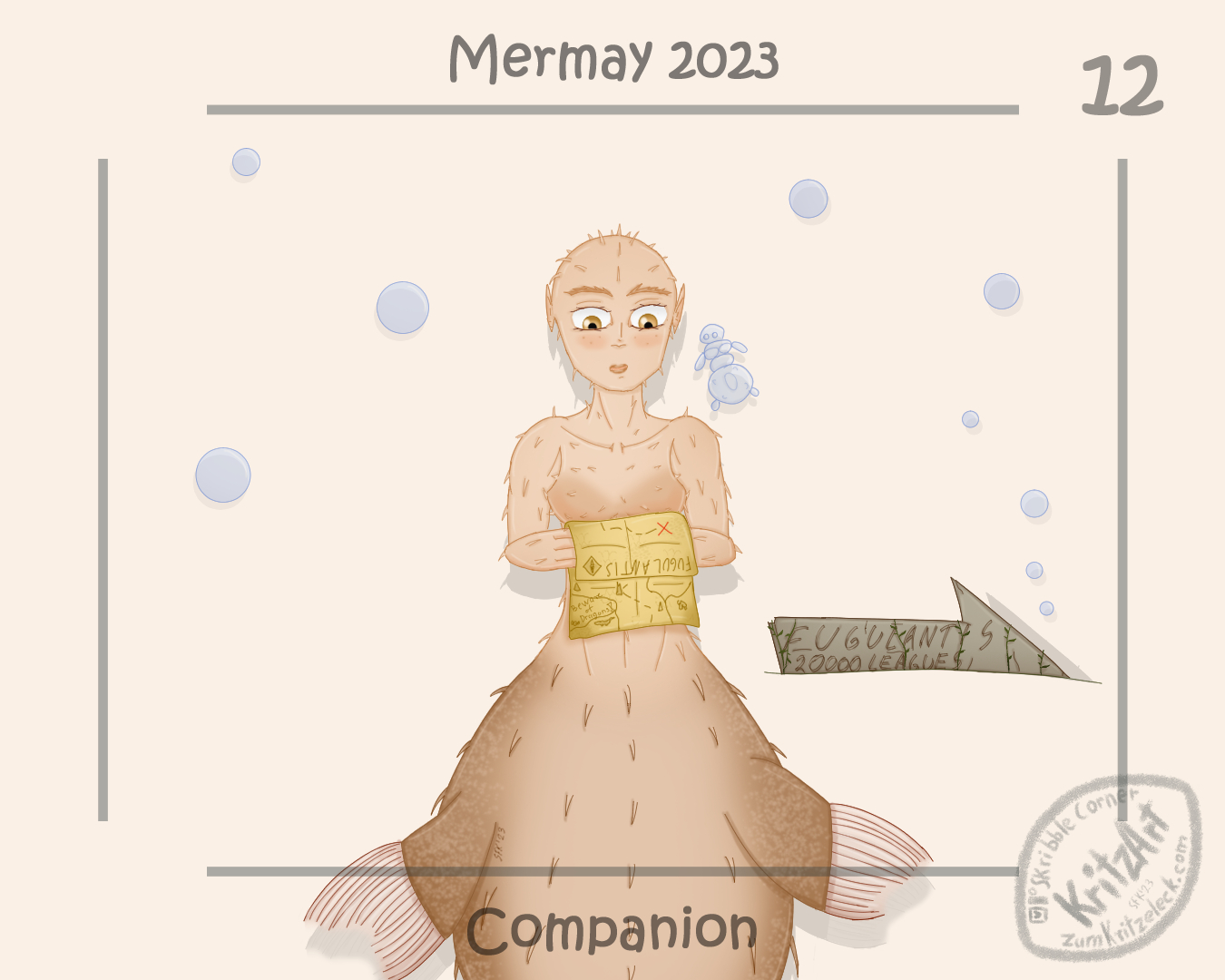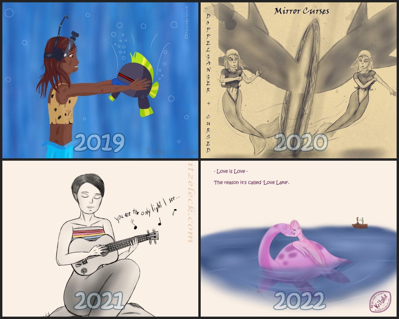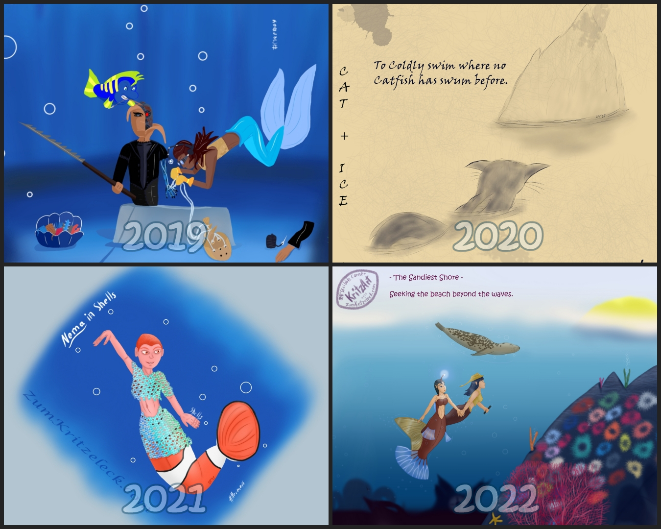 In 2023 I will go with the official Mermay prompt list. This time, it’s a special Mermay to me because it’s my fifth participation in a row. Starting with 2019 I managed to create every May for every day at least a sketch, a collage, but mostly a full drawing in different styles, colour schemes and approaches. Therefore, in 2023 I not only drew the given prompts, but also collages of past paintings of every day in previous Mermays.