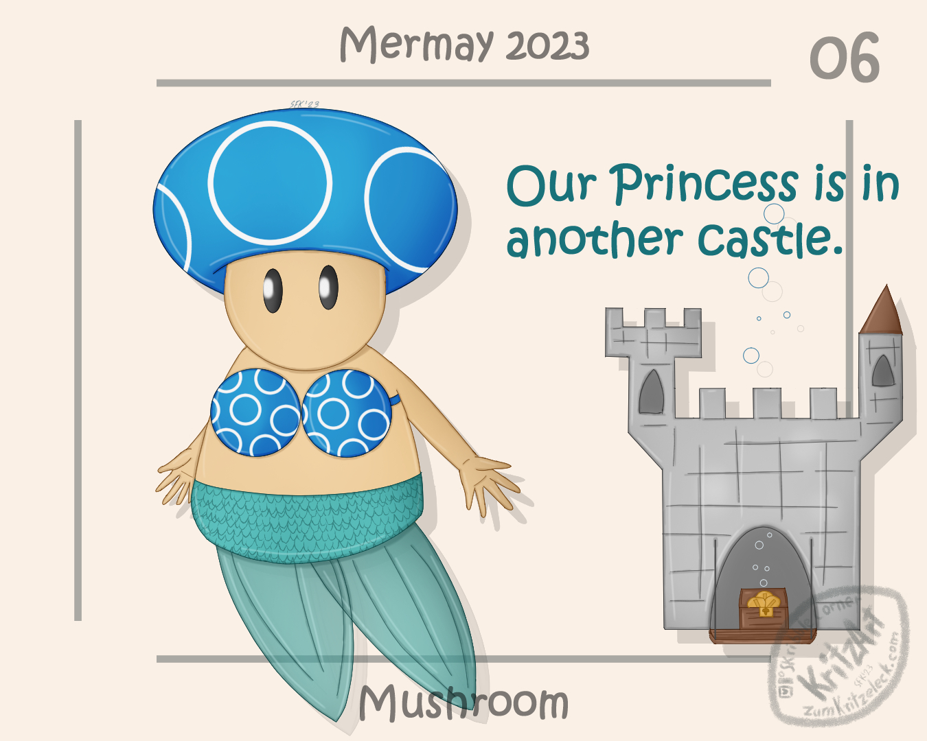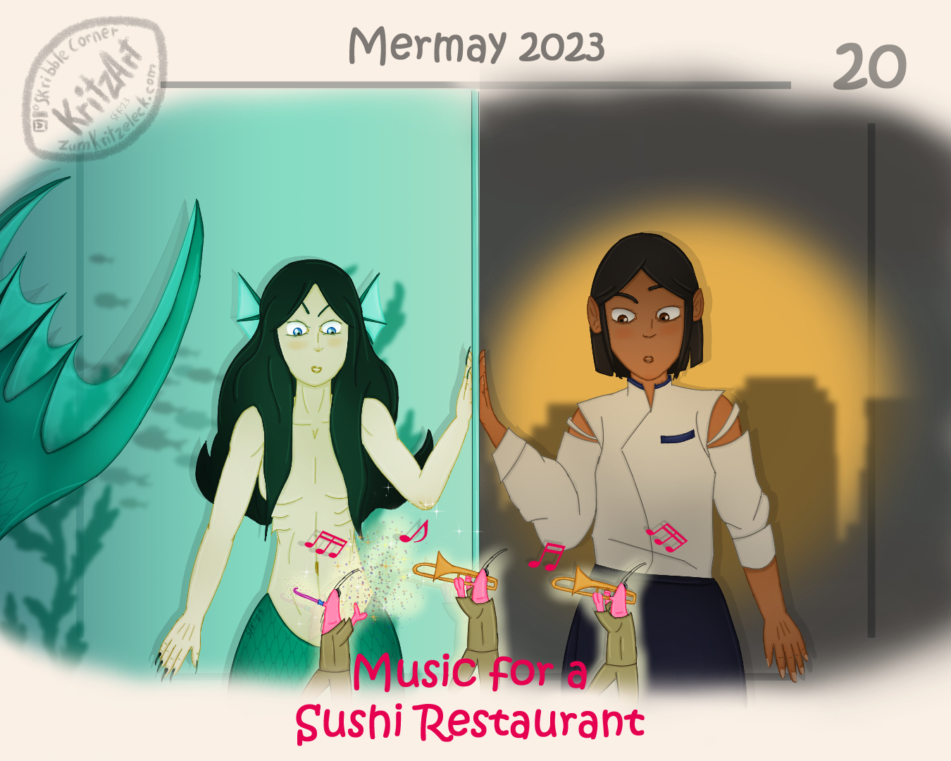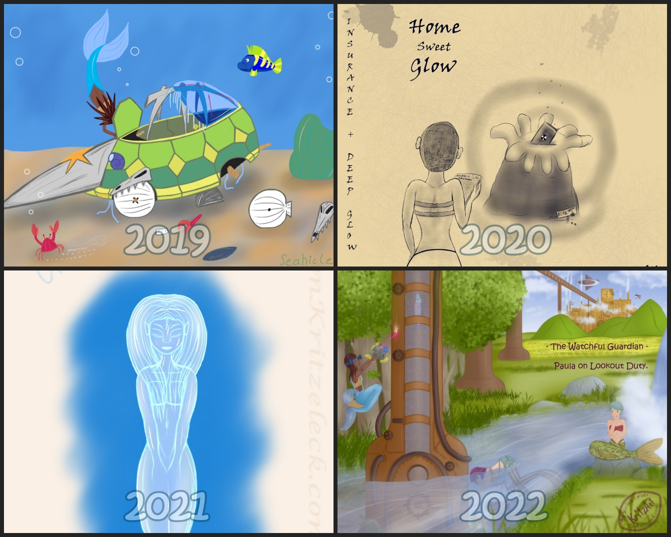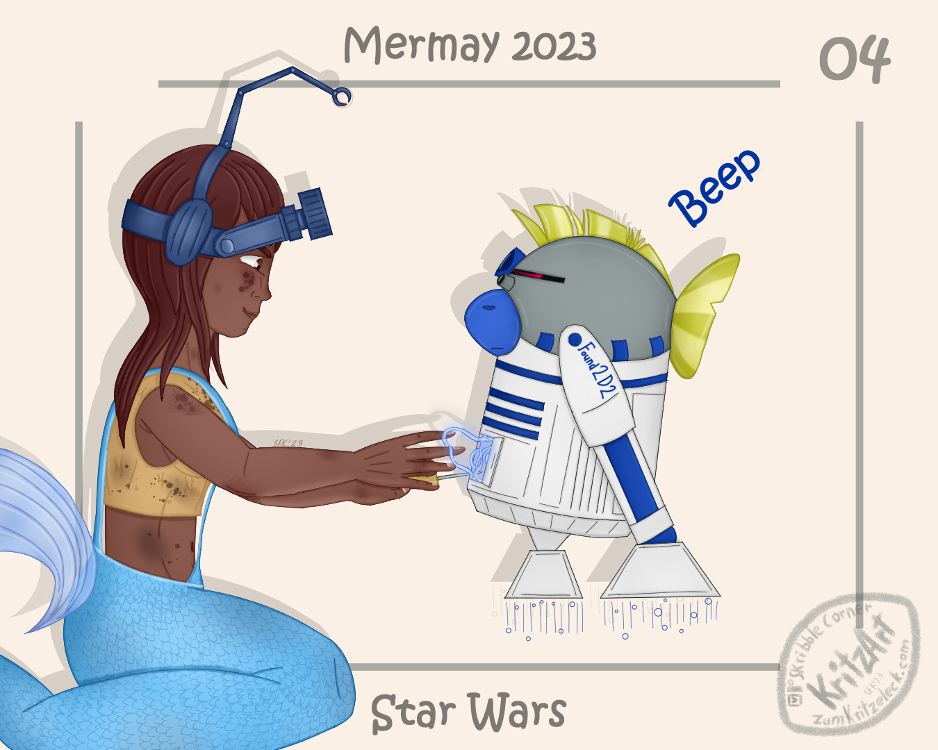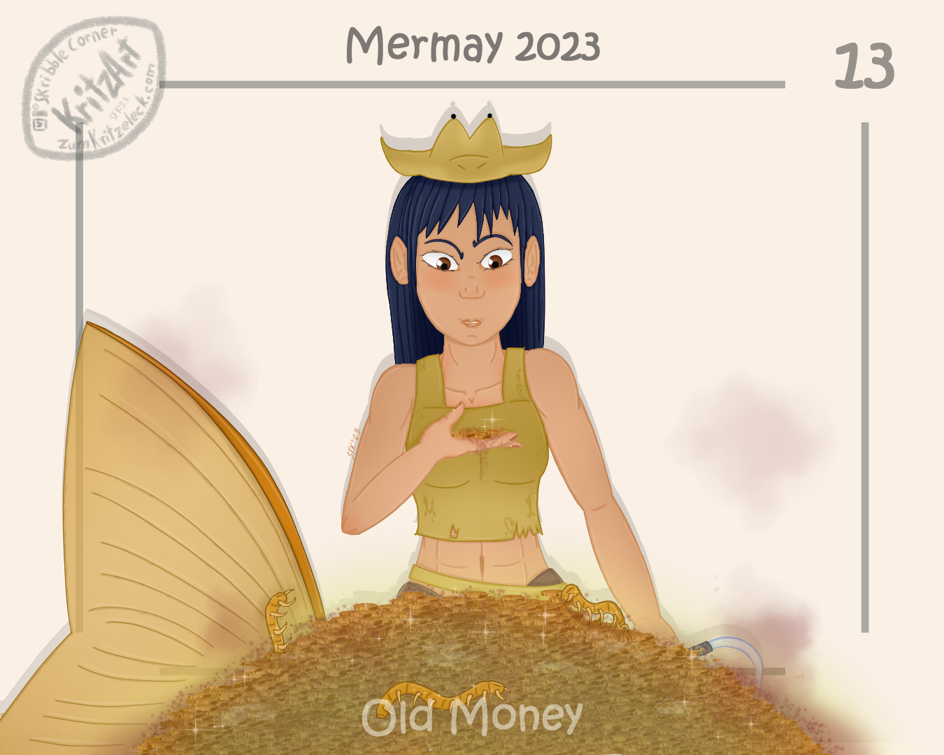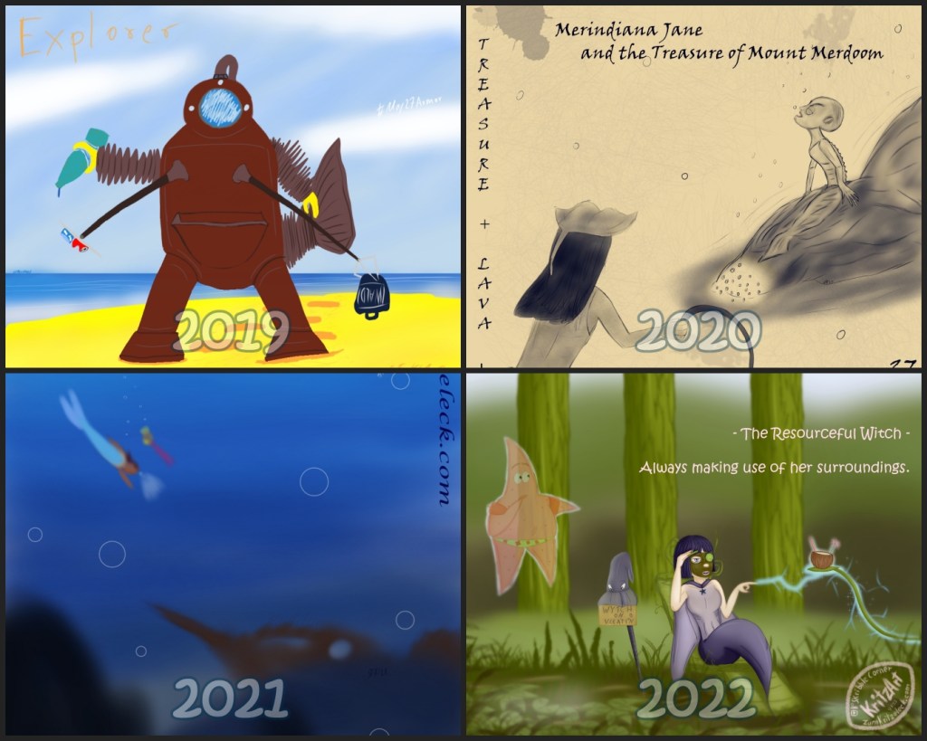 In 2023 I will go with the official Mermay prompt list. This time, it’s a special Mermay to me because it’s my fifth participation in a row. Starting with 2019 I managed to create every May for every day at least a sketch, a collage, but mostly a full drawing in different styles, colour schemes and approaches. Therefore, in 2023 I not only drew the given prompts, but also collages of past paintings of every day in previous Mermays.