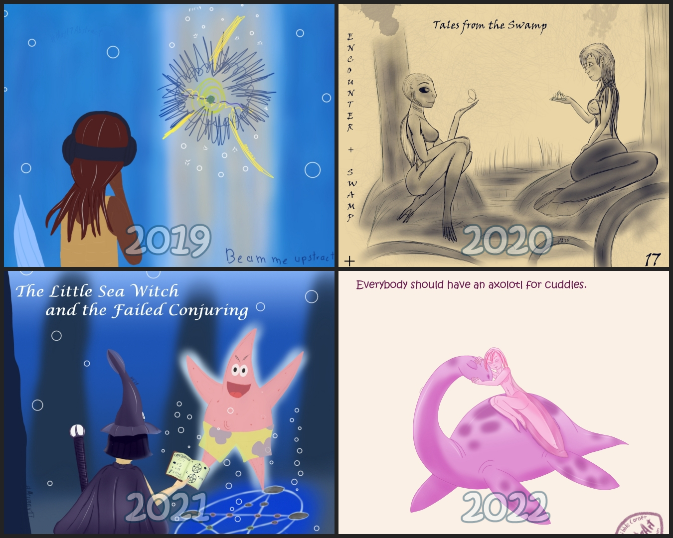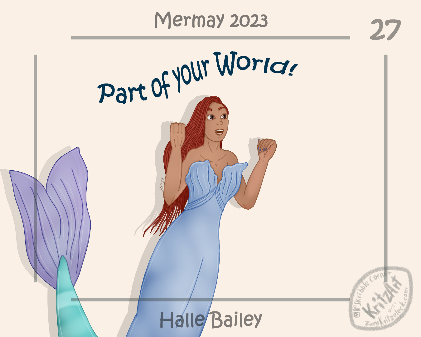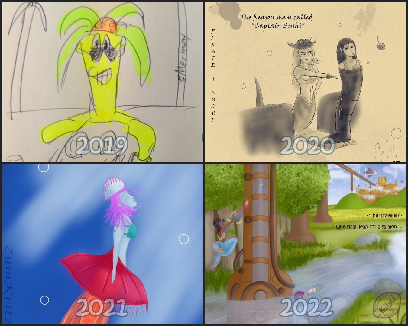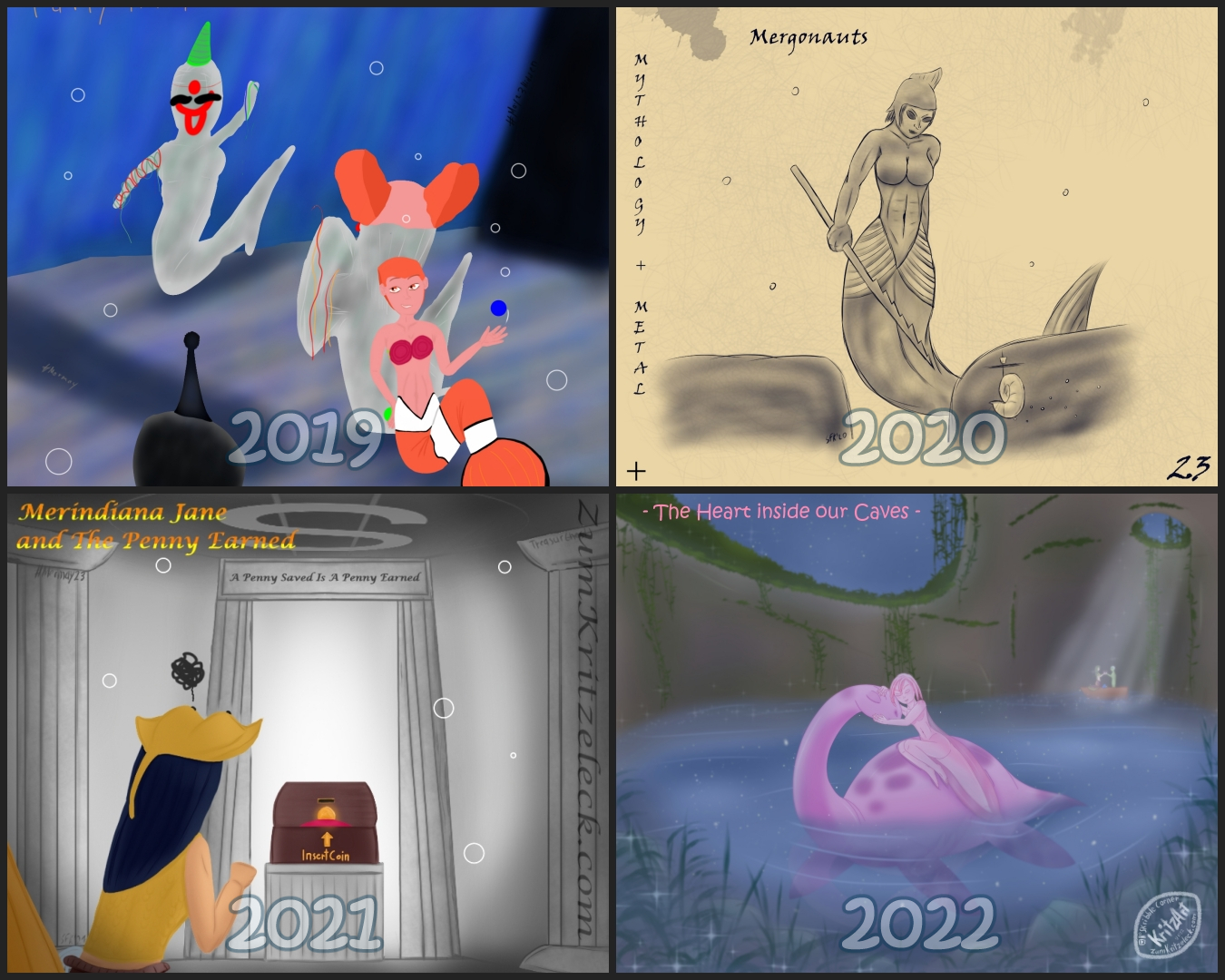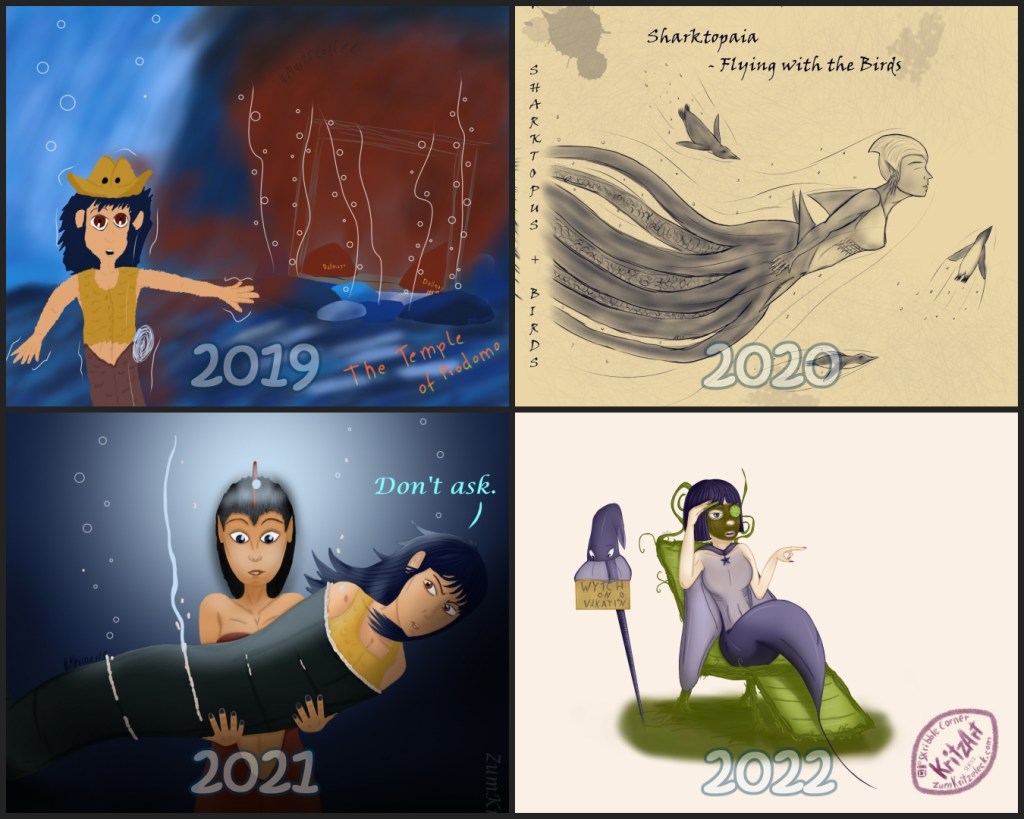 In 2023 I will go with the official Mermay prompt list. This time, it’s a special Mermay to me because it’s my fifth participation in a row. Starting with 2019 I managed to create every May for every day at least a sketch, a collage, but mostly a full drawing in different styles, colour schemes and approaches. Therefore, in 2023 I not only drew the given prompts, but also collages of past paintings of every day in previous Mermays.