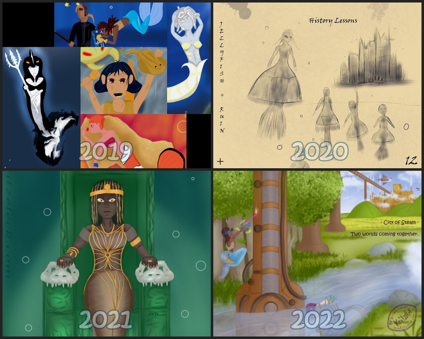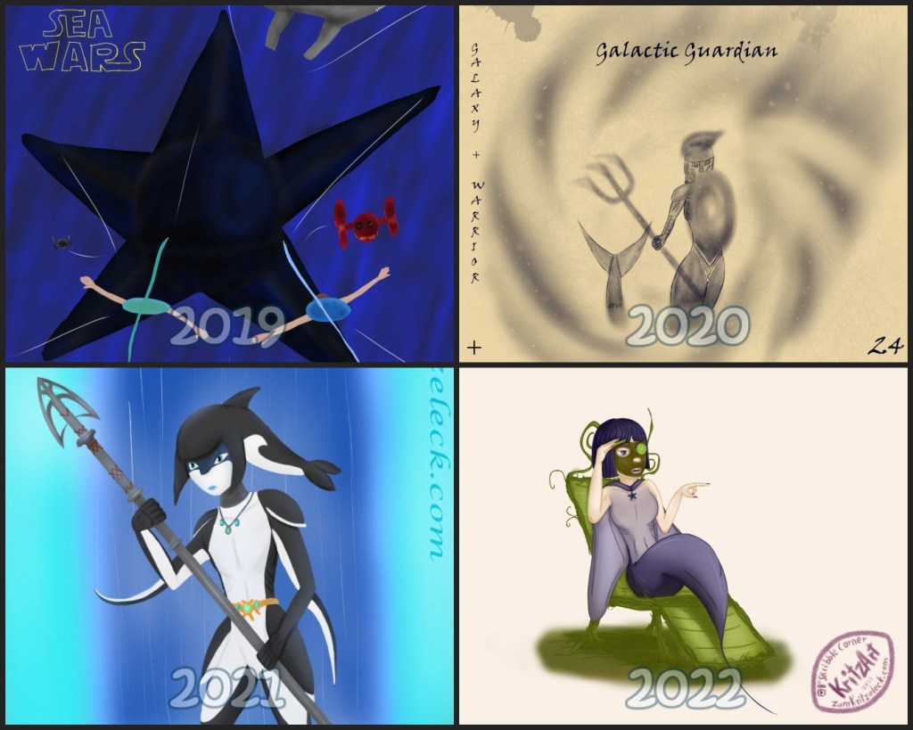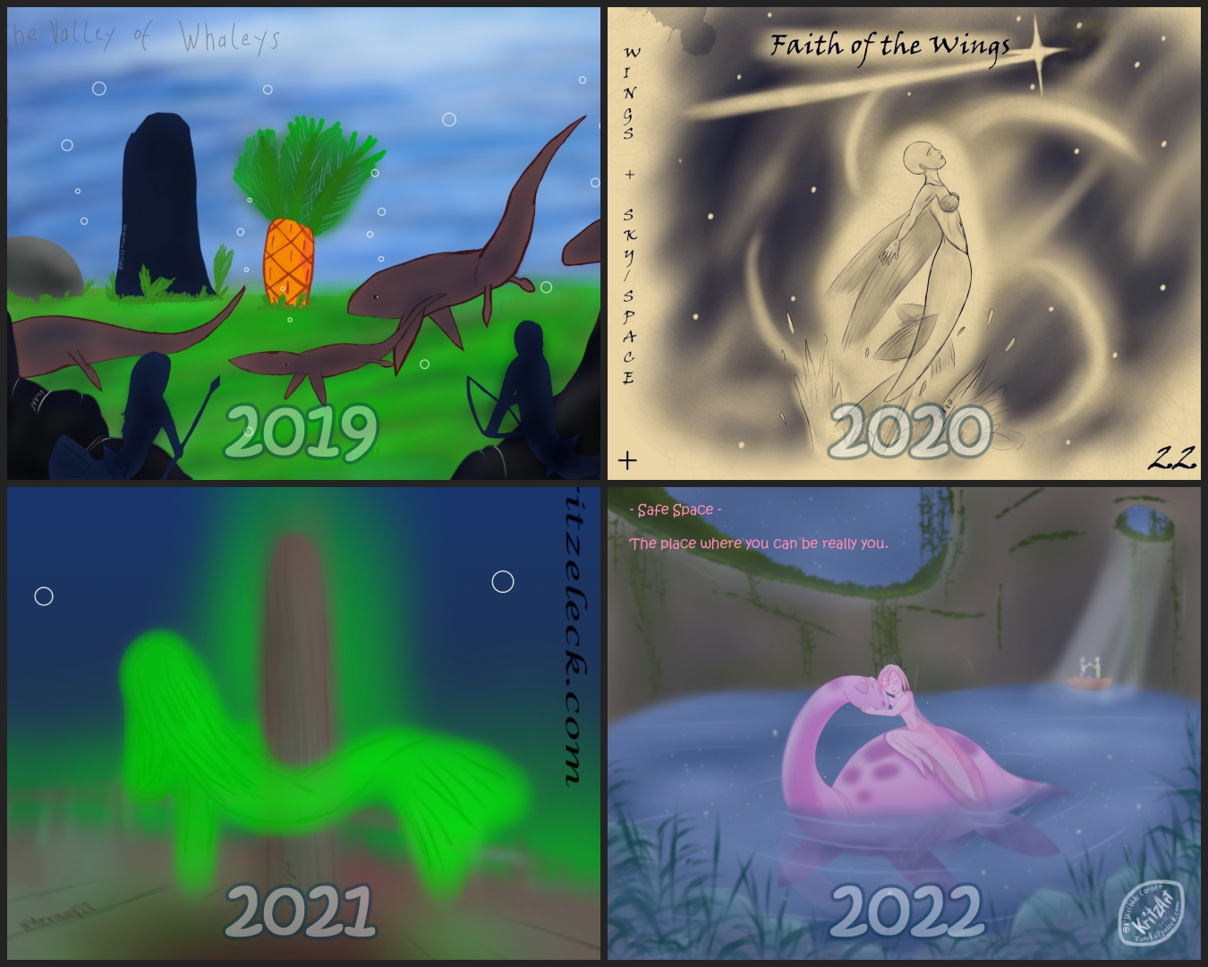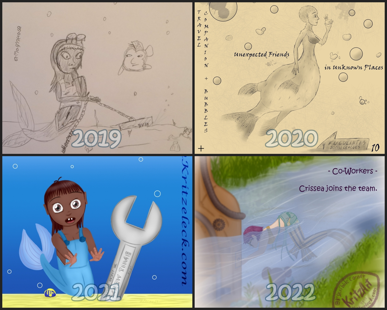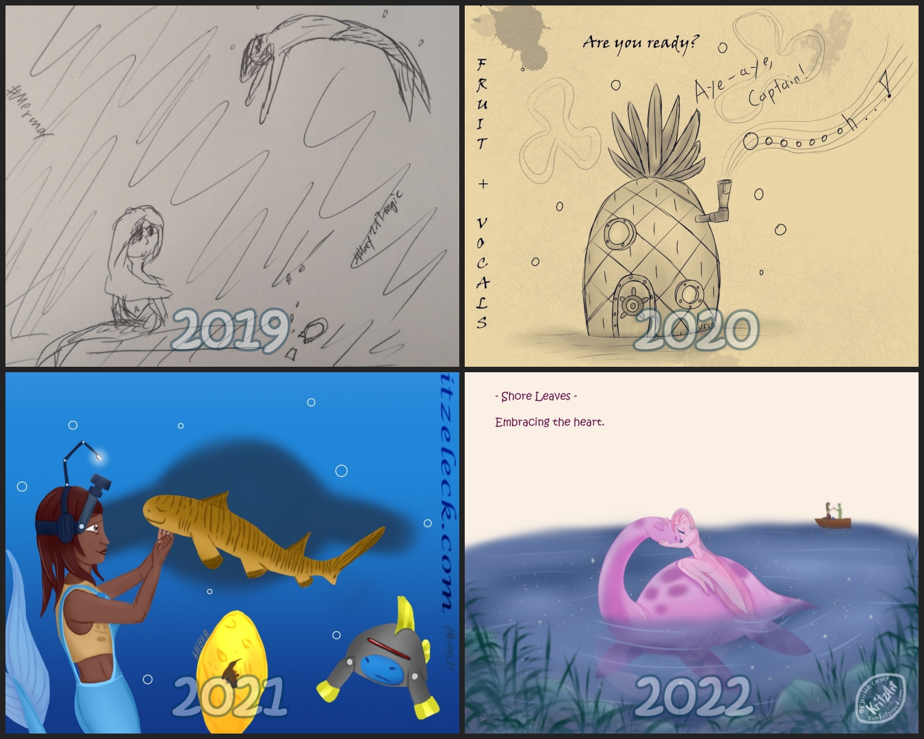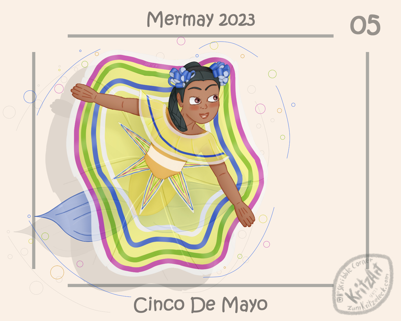 In 2023 I will go with the official Mermay prompt list. This time, it’s a special Mermay to me because it’s my fifth participation in a row. Starting with 2019 I managed to create every May for every day at least a sketch, a collage, but mostly a full drawing in different styles, colour schemes and approaches. Therefore, in 2023 I not only drew the given prompts, but also collages of past paintings of every day in previous Mermays.