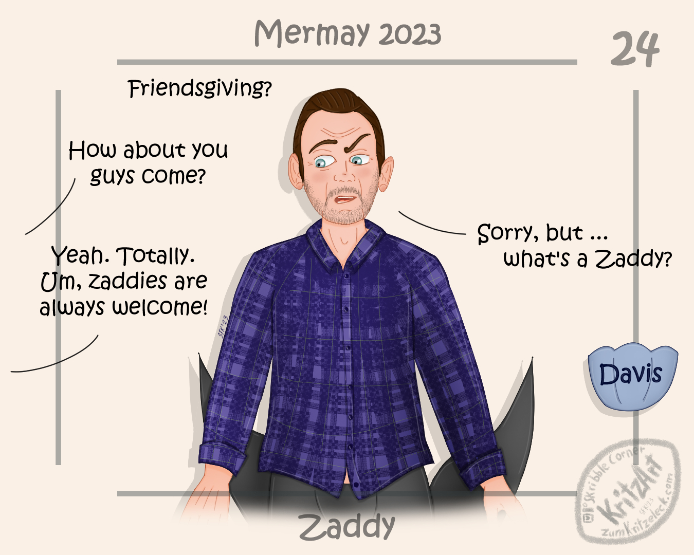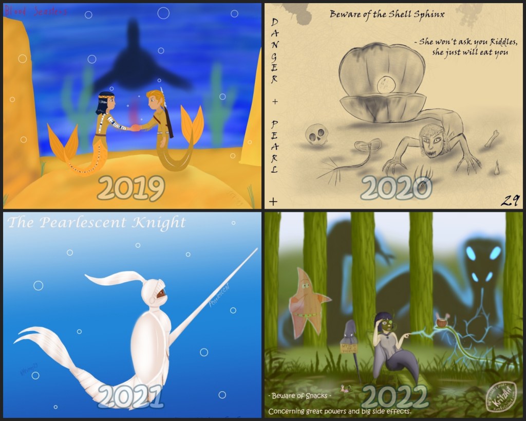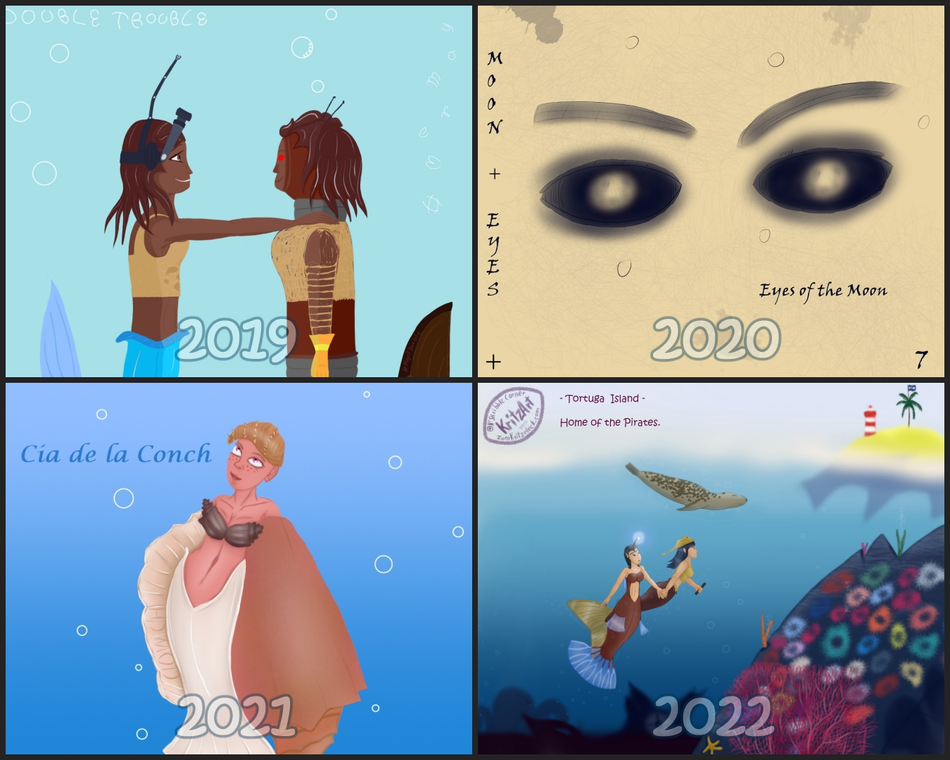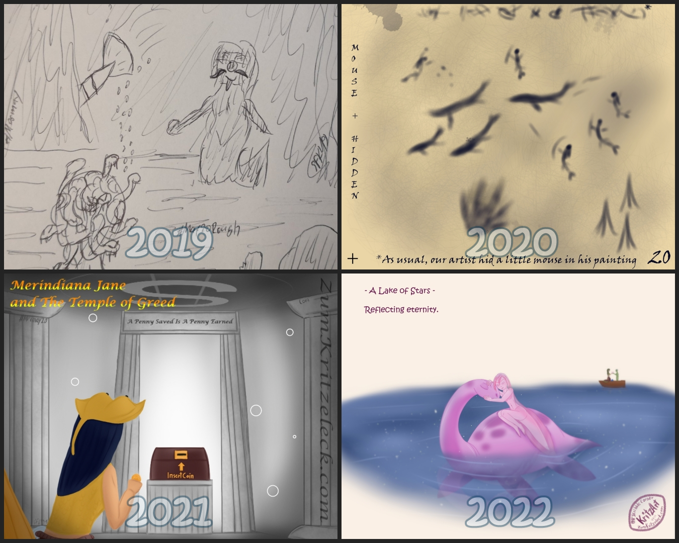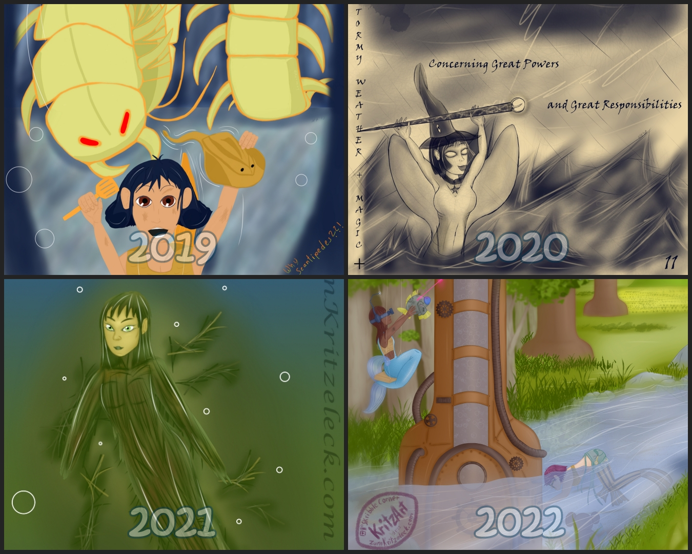 In 2023 I will go with the official Mermay prompt list. This time, it’s a special Mermay to me because it’s my fifth participation in a row. Starting with 2019 I managed to create every May for every day at least a sketch, a collage, but mostly a full drawing in different styles, colour schemes and approaches. Therefore, in 2023 I not only drew the given prompts, but also collages of past paintings of every day in previous Mermays.