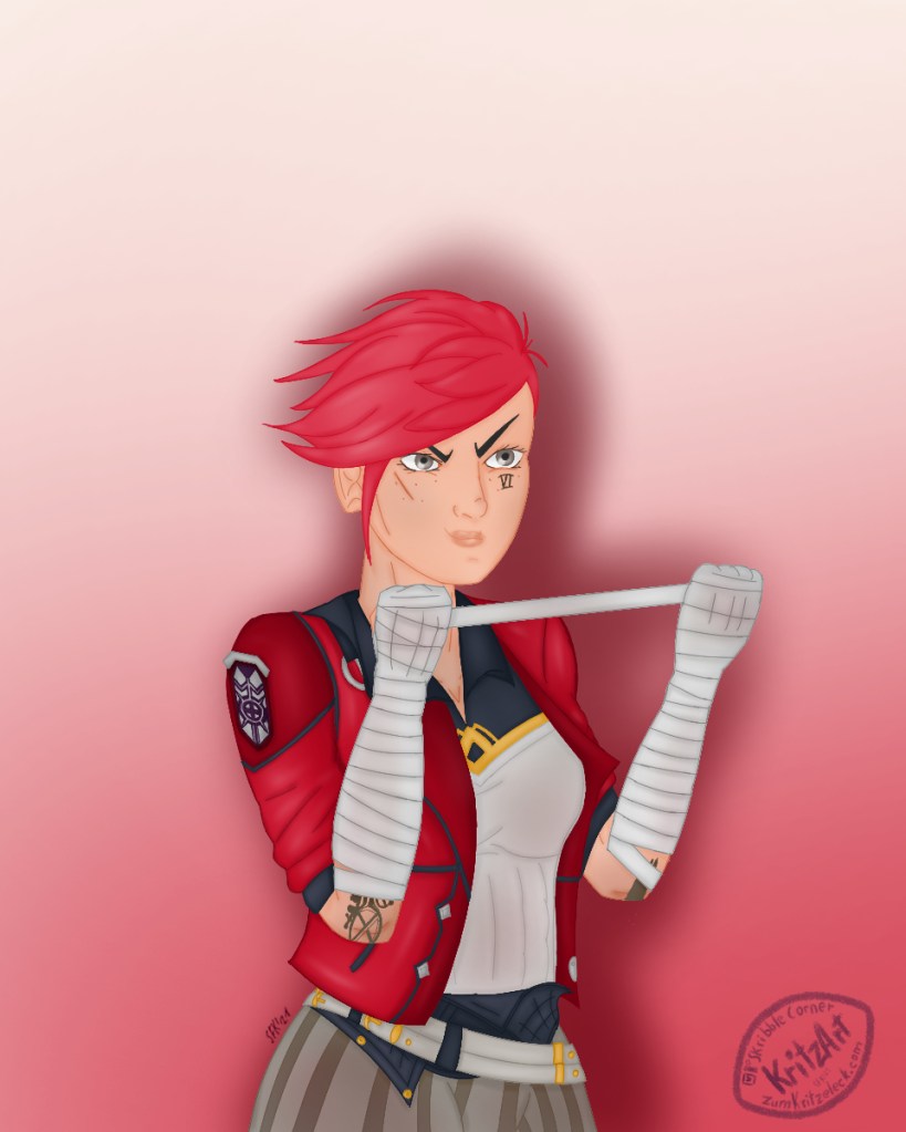 You easily can see how terrible my sketches are and that in the beginning I had another pose for Vi in mind than I actually switched to. Those sketches are only crutches for my thoughts, I look on this messy lines, I don’t even recognize something in them but those lines are leading my thoughts back to the painting I had in mind. And they can lead mit fingers when the actual painting process starts.