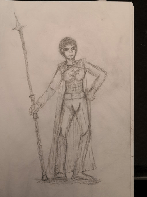 I am rather proud of this painting. I like her short, spikey hair and how the hands turned out. In the background you can see an eagle ray (look up mythology books, if you don’t get the reference at first glance) and her whole pose and her clothes resembles two famous portrayals of Pronetheus the Fire Bringer.