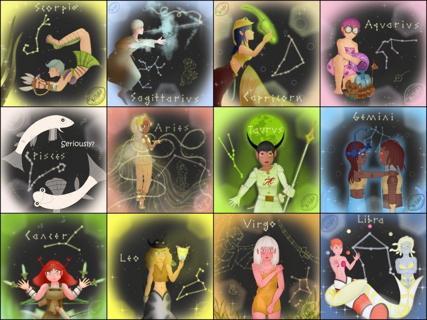 The featured OCs are not necessarily born under the sign they depict, I just drew the OC who popped up in my mind when I thought of it. Plus, I think this goes without saying, the Zodiac versions of the OCs are not canon regarding their respective universes.